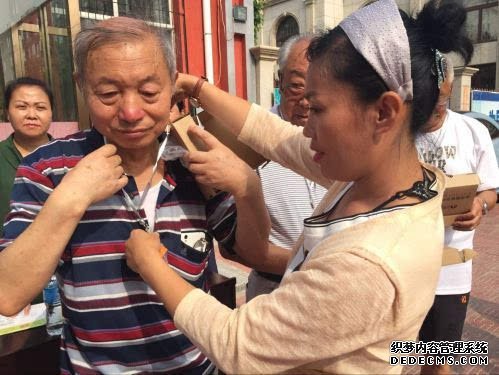 老人将敬老孝心牌佩戴在胸前,市民即可以通过敬老孝心牌了解12349服务功能,还能延长老年人乘车爱心卡使用寿命,老人可以随身携带。