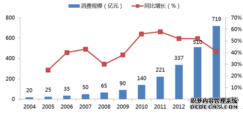 2004-2014 年国内宠物行业消费规模与同比增速