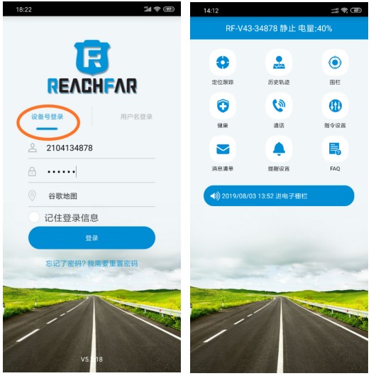 在“Reachfar”或”Anytracking” APP上输入设备号,默认密码是123456。点击登录按钮登录。