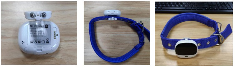 2.将项圈薄的一端夹入狗用GPS追踪器和背夹中间,夹紧背夹