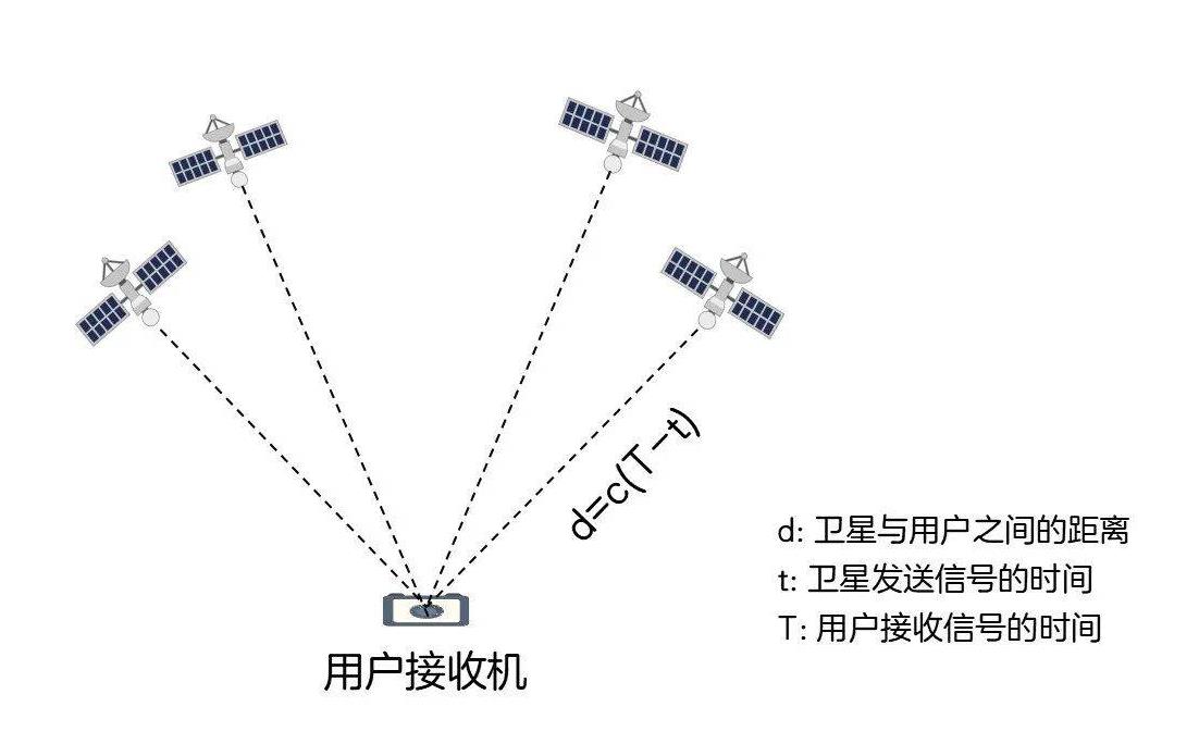 如果接收机同时接收到了至少4颗卫星发射的信号,则可以通过三角定位原理计算出接收机的位置。具体来说,假设接收机的位置为(x,y,z),第i颗卫星的位置为(xi,yi,zi),则有: