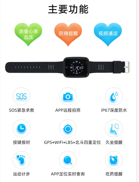 老年健康安全手表是由深圳锐峰汇智推出的一款专门面向老人的智能手表,这款手表具有GPS定位、电子围栏、心率、血压、血氧监测、计步、紧急求救等功能。