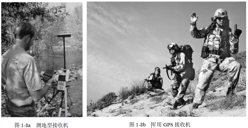 用户设备部分的主要设备是GPS接收机,它是一种特制的无线电接收机。其主要作用是接收导航卫星发出的信号,对卫星信号进行处理后依据所得数据确定接收机所在的地理位 置。根据不同性质的用户和所需的功能,需要配置不同种类的GPS 接收机。其性能结构、形 状尺寸和价格也大相径庭。例如:航海和航空用的导航型接收机,要具有与存储卡或其它媒 介相互通讯的功能,因为其中存有电子导航图等资料;测地用的接收机(如图1-8a)就要求 具有很高的精度,并能快速采集和存储数据;军用的接收机,要附加解码模块,如果用于地 面部队则要求较高的机动性(如图1-8b 为便携式军用GPS 接收机)。