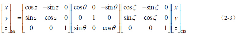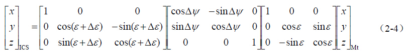 为了将卫星在J2000.0 协议天球坐标系中的坐标转换到实际观测历元t 的瞬时天球坐标系 中,通常可以分为两步:首先是将J2000.0 协议天球坐标系中的坐标,转换到观测历元t 的瞬 时平天球坐标系中;然后再将瞬时平天球坐标系中的坐标,转换到观测历元t 的瞬时天球坐 标系中。假设(x y z)CIS 、(x y z)Mt 和(x y z)ICS 分别表示卫星在J2000.0 协议天球 坐标系、观测历元t 的瞬时平天球坐标系和观测历元t 的瞬时天球坐标系中的坐标,其转换 过程为: