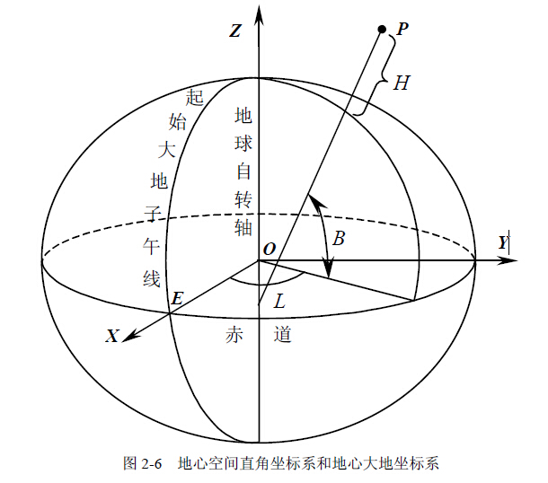 在地心大地坐标系中,地球椭球的中心与地球质心重合,椭球短轴与自转轴重合,起始 大地子午面(Initial Geodetic Meridian Plane)与起始天文子午面重合。这样,P 点的坐标可 以表示为P(L,B,H)。其中,L 表示大地经度(Geodetic Longitude),即过P 点的大地子 午面与起始大地子午面的夹角。B 表示大地纬度(Geodetic Latitude),即P 点的法线方向与 赤道面的夹角。H 表示大地高(Ellipsoidal Height),即P 点沿法线方向到椭球面的距离。