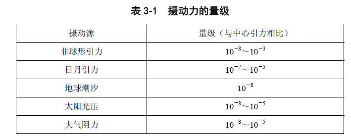 为了研究和应用的方便,通常把作用于卫星的力分为两类:一类是中心引力(Central Gravitational Force),它是匀质椭球产生的引力;另一类是摄动力(Perturbative Force),包括 非球形引力、日月引力、潮汐力、大气阻力和太阳光压等。由于二者的大小相差悬殊(详见 表3-1),实际上是中心引力决定着卫星运动的基本特征,由此求得的卫星轨道可以视作理想轨道,该轨道是分析卫星实际轨道的基础。
