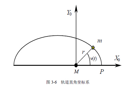 1.卫星在轨道直角坐标系中的位置 如图3-6 所示,取地球质心M 为坐标原点,X0 轴指向近地点P,Z0 轴垂直于轨道平面, Y0 轴在轨道面内垂直于X0 轴构成右手系。在该坐标系中,卫星ms 的坐标为(x0,y0,z0) T 。