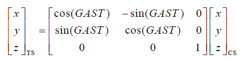 有了卫星的天球坐标,就可以根据天球坐标系与地球坐标系的关系,进一步计算卫星在 地球坐标系中的位置。设(X,Y,Z)TS 为卫星在地球坐标系中的坐标。则有: