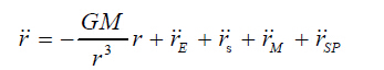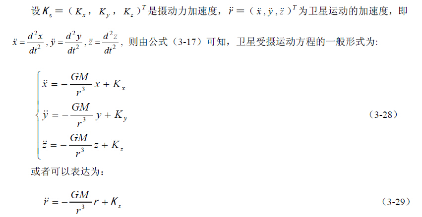 总的说来,摄动力可以分为两类:保守力(Conservative Force)和耗散力(Dissipative Force)。前者可以用位函数来表示受摄运动方程,比如非球形引力和日月引力;后者不宜用 位函数表示,而只能用摄动力表示受摄运动方程,比如潮汐力、大气阻力和太阳光压。理论 分析表明,GPS 卫星作为高轨卫星,对大气阻力、潮汐力(包括海潮、固体潮和大气潮)、 地球反射光压以及非球形引力位展开式的高阶项并不敏感。如果将它们忽略不计,则方程 (3-31)可以进一步简化为: