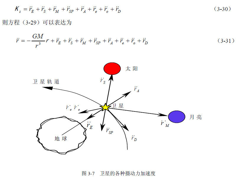 在方程(3-29)中,K s是所有摄动力加速度之和。如果引入符号: E &r& 为非球形引力摄动加速度(Acceleration Due to the Non-spherically and Inhomogeneous Mass Distribution within the Earth); S r&& 、M &r& 为日、月引力摄动加速度(Accelerations Due to the Sun and the Moon); SP &r& 、&r&A为太阳光压、地球反射光压(Accelerations Due to Direct and Earth-reflected Solar Radiation Pressure); e &r&、 o &r& 为固体潮和海潮摄动加速度(Accelerations Due to Earth and Oceanic Tides); D &r& 为大气阻力摄动加速度(Acceleration Due to the Atmospheric Drag)。 如图3-7 所示,即有:
