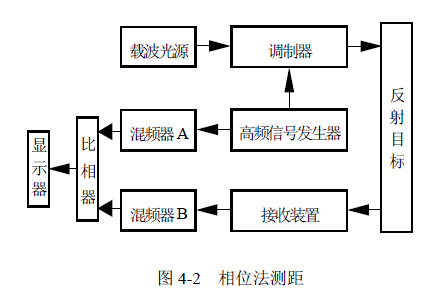 相位法测距的基本原理如图 4-2 所示。由载波光源发出的光信号通过调制器(Modulator)进行调制,输出成为光强随高频信号变化的调制光波(Modulated Light),射向被测目标。与此同时,高频信号发生器也向混频器A 发出相同频率的参考信号,调制光波经由被测目标反射后回到接收装置,继而又进入混频器B,成为测距信号。由此,只要比较参考信号与测距信号之间的相位移(Displacement Phase),就能得出被测距离。