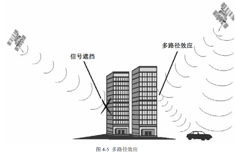 理想状态下,卫星信号将沿最短路径直接达到接收机天线。而如果天线附近有反射物, 如图4-5 所示,这时接收机天线几乎同时收到卫星的直接信号与反射信号,两种信号的叠加 将使观测值产生附加时延量,这种现象称为多路径效应。多路径效应的影响(Multipath Rrror) 属于电磁波传输过程中的误差,它会使载波相位观测量产生“周跳”,严重时将导致卫星信号失锁。