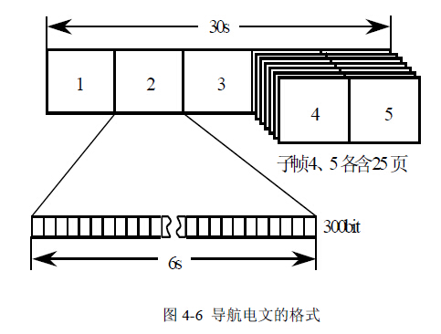 如图4-6 所示,每帧电文包括5 个子帧(Subframe),每个子帧有300bit,其播发时间为 6s。其中子帧4、5 各包含25 页,子帧1、2、3 与子帧4、5 的每一页,均构成完整的一帧。 子帧1、2、3 的内容每小时更新,而子帧4、5 的内容仅在卫星注入新的数据后才得以更新。 导航电文全部播发完毕需要12.5min。