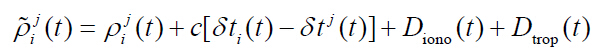 一般说来,大气折射影响虽经模型改正,但依然含有残余影响,需要在观测方程中加以考虑。取符号:~ j (t)i ρ表示在观测历元t,卫星j 到接收机i 的伪距观测量;