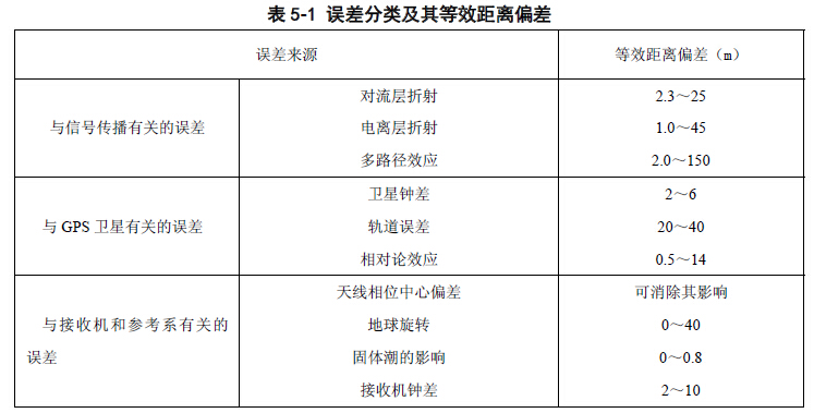 误差的大小往往与卫星的位置、待定点的位置、接收机设备、观测的时间、大气环境和 地理环境等因素有关。这些误差源对GPS 定位的影响各不相同,为了便于理解,通常将各种 误差的影响转换到测站与卫星之间的距离上,以相应的距离误差表示。表5-1 就是它们的等 效距离偏差。