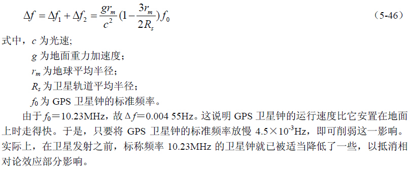 根据狭义相对论的观点,由于卫星时钟与接收机时钟在惯性系中的运动速度不同,卫星 钟相对接收机而言将产生频率偏移,其结果是卫星时钟“变慢”。另外,根据广义相对论的 理论,由于卫星所在位置的引力位与地表引力位不同,其振荡器频率将产生相对变化。这种 现象通常称为引力频移(Gravitational Shift),其结果是使得卫星时钟“变快”。
