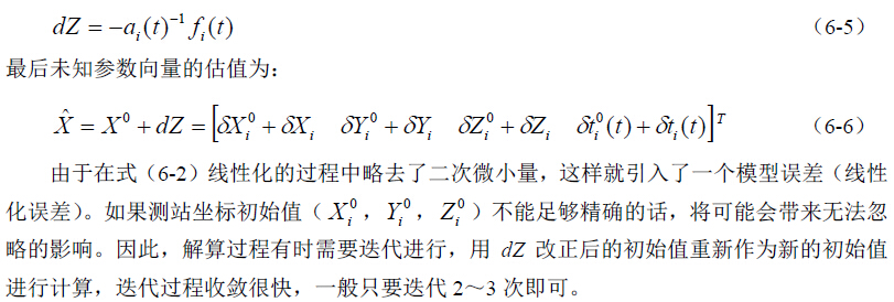 在动态绝对定位的情况下,由于接收机处于运动状态,待定点的位置总是实时变化的。 因此,一般说来每个待定点只能获得一个历元的观测值。根据5.3.1 的论述,对于一个测站 点,只要获得一个观测历元4 颗卫星的观测值,便可唯一求得该测站点的坐标。如果多于4 颗卫星(存在多余观测),则可以进行平差计算。