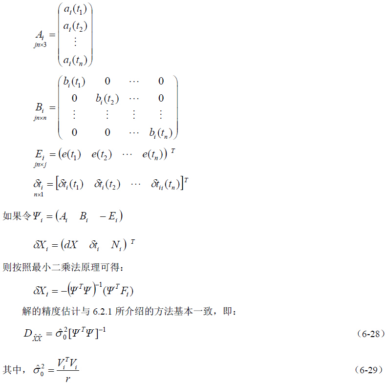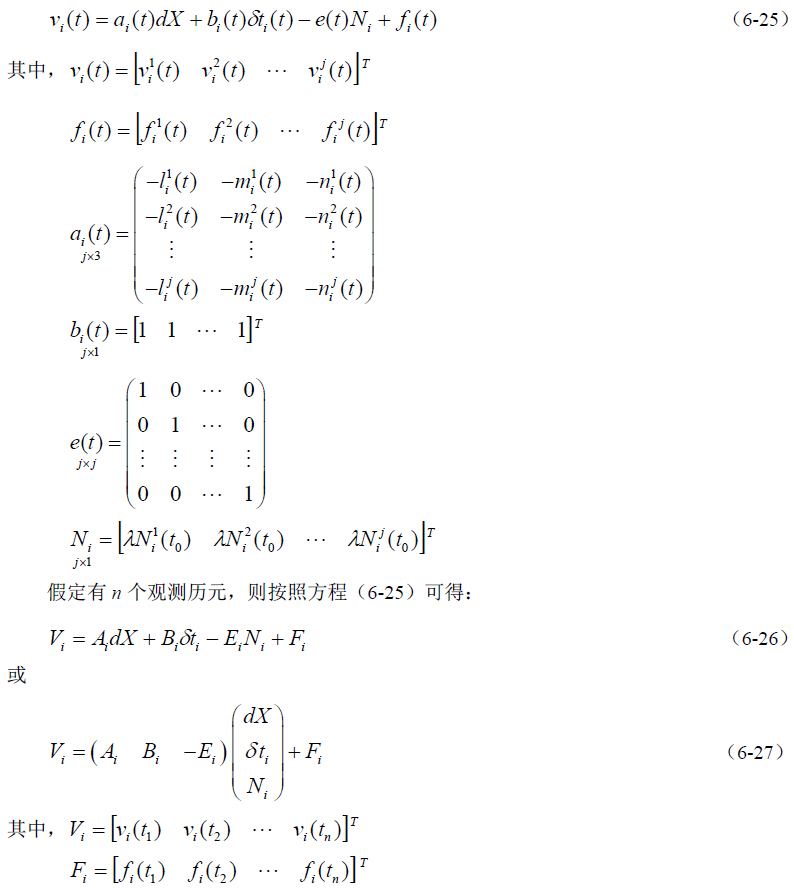 载波相位测量静态绝对定位与载波相位测量的动态绝对定位不同,后者在每个测站只有 一个历元的观测数据。一个观测历元时的误差方程就如(6-18)所示,为了推导方便,现将 (6-18)式变形为: