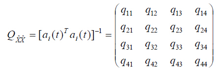 根据概率统计的有关知识,一组随机参数的统计特征可以用相应的协因数阵(Correlation Matrix)来描述。协因数阵也叫相关系数矩阵或相关矩阵,它包含有全部解的精度和相关性 信息,是精度评价的重要依据之一。如果以6.3.1 中测码伪距动态绝对定位为例,则未知参 数的协因数阵为: