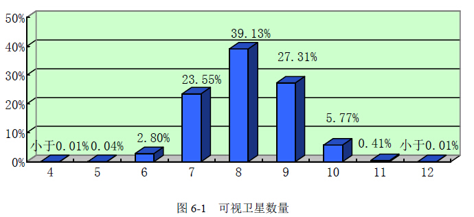 如图6-1 所示,这是测站点的可视卫星个数在24hr 观测时段内所占时间的比重。显然, 可视卫星个数小于等于4 的情况是非常少见的(小于0.01%),大多数情况为6~10 颗(约 99%),平均约为8 颗卫星。这样就能够保证足够的卫星数目和观测精度。