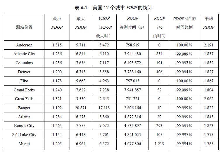 表6-1 所示为2001 年7~9 月间,在美国12 个城市进行静态观测时PDOP 的统计汇总。 显然,多数情况下PDOP 的均值都不超过2,这说明目前的GPS 卫星配置良好,具有较好的 卫星可视性。从表6-1 中可以发现,当PDOP 最大时,VDOP 往往也较大,这说明当时所测 卫星的几何分布,对于水平位置和高程都比较弱。
