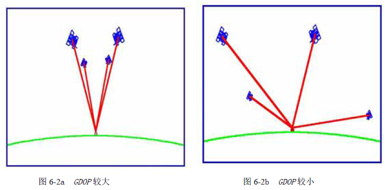 当然,卫星高度角也不是越高越好。虽然天顶方向上(高度角为90°)的卫星信号受大 气折光的影响最小,但如果卫星的高度角都很大的话,那么所测卫星将聚集在一个较小的范 围里,这时高程解与接收机钟差解的相关性将很强,因而二者都不能精确求解(如图6-2a 所 示)。假如测站与观测到的4 颗卫星,构成六面体的体积等于Vol。经分析表明,精度因子 GDOP 与该六面体的体积Vol 的大小成反比。换言之,六面体体积越大,则GDOP 就越小, 定位精度就越高,反之亦然。
