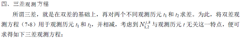 因为GPS 接收机使用稳定性较差的石英钟,它难以用模型表示。如果将每个观测历元的接收机钟差都作为未知数求解,则将使解算基线向量的法方程中的未知数个数大大增加(例如,15s 观测一次,在1hr 观测中,每台接收机将有240 个钟差未知数)。使用双差模型后,接收机钟差的影响被消除了,它既不涉及钟差模型,又使法方程中未知数个数大大减少,很方便地解决了GPS 数据处理中一个棘手的问题。所以,几乎所有的GPS 基线解算软件,都使用双差观测模型。但双差观测模型的方程个数比单差模型减少,对解算精度可能造成不利影响。
