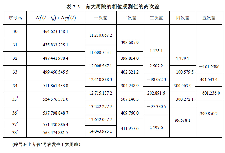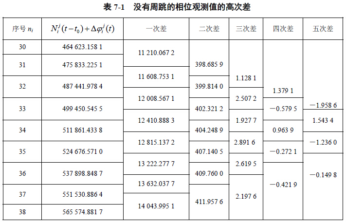 的变化是平滑的,有规律的。如果观测值中出现周跳,则将 破坏这种平滑性和规律性。但由于卫星相对于接收机距离的变化可达每秒钟数千周,如果10s 观测一次,这种变化可达数万周,不易发现数十周的周跳。为此,可对相邻观测值求高次差, 以削弱站星距变化对整周计数值的影响。在这种情况下,如果没有周跳,则求4~5 次差后的 载波相位观测值的变化,主要是GPS 接收机的晶体振荡器不稳定引起的,它们应呈偶然性误 差,且数值为几周以下(如表7-1);否则,求4~5 次差后,其变化不再具有偶然性,且数值 比产生的周跳值还要大(如表7-2)。该表在序号ni 为35 处,发生丢失100 周的大周跳,据 此,我们能够找到产生较大周跳的地方,并对其进行修复。