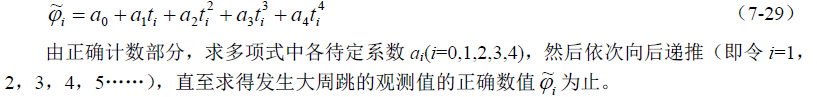 为了确定大周跳的数值,可根据发生周跳前的4~5 个历元的观测值,用高次插值公式外插求出表7-2 中序号为35 的正确观测值(这里仅用计数值的整数部分,小数部分仍用原观测 值)。求得丢失的整周数后,还须对其后的观测值依次进行改正。