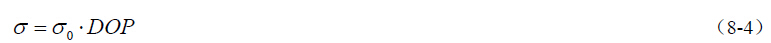 GPS 定位的精度取决于测量误差和卫星星座几何图形强度两个因素。前者与接收机误 差、卫星误差和信号传播误差等有关;后者只与被测卫星星座相对于观测站的几何位置有关, 或者说与图形强度因子(也称几何误差放大因子或精度因子)有关。 设0 σ 代表测量标准差,DOP(Dilution of Precision)代表精度因子,σ 代表定位标准 差,则: