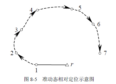 该定位模式的作业过程如下:在测区选 择一基准站r,在其上安置一台接收机,连 续跟踪观测所有可见卫星。安置另一台(或 多台)流动接收机于起始点1 上(如图8-5 所示),观测几分钟,以便快速确定其整周 未知数。此过程称为初始化。流动接收机完 成初始化后,则可按预定计划依次迁往各流 动站(2,3,⋯⋯),并在迁站过程中保持 对不少于4 颗卫星的连续跟踪(即保持所测 卫星的整周未知数不变),则每个流动站只 需观测几个历元(每秒钟测一次,只需几秒钟),便可以测定其相对于基准站的基线向量。 如果在观测过程中(包括迁站),某些卫星发生失锁,被测卫星少于4 颗,则可在待测 流动点上重新完成初始化(静止观测几分钟),然后继续往前测。流动站至基准站的距离, 目前以不大于15km 为宜。