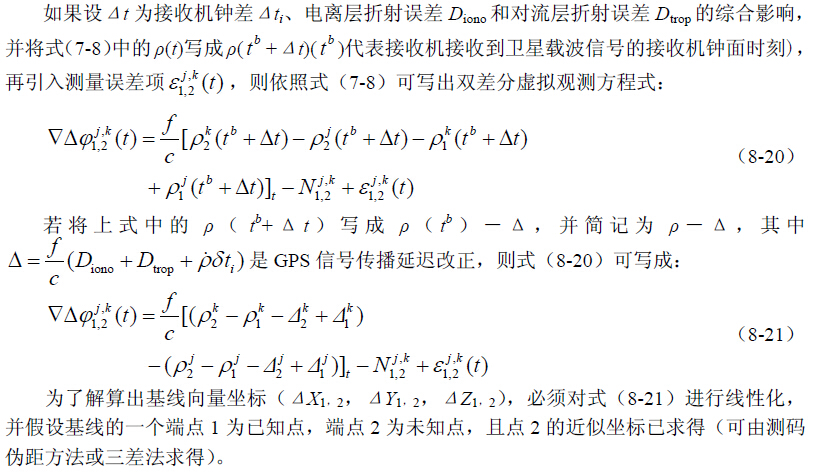 在第七章中已经讨论过,由载波相位观测值组成的双差观测模型式(7-8)中,可消去卫星钟差和接收机钟差的影响,对30km 以下的基线,还可大大削弱电离层、对流层折射影响和卫星星历误差影响。因而在基线向量解算时,通常采用双差数学模型。它既可消除或削弱一些难以建立误差模型的误差,提高了基线解算的精度,又使方程式中的未知数个数大为减少,减轻了平差计算的难度和工作量。