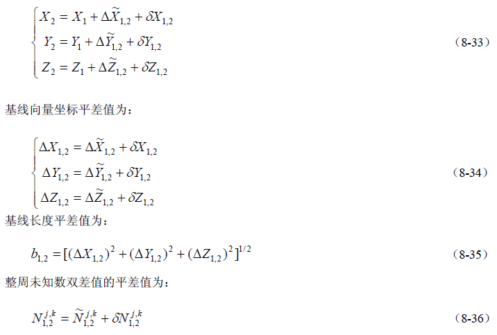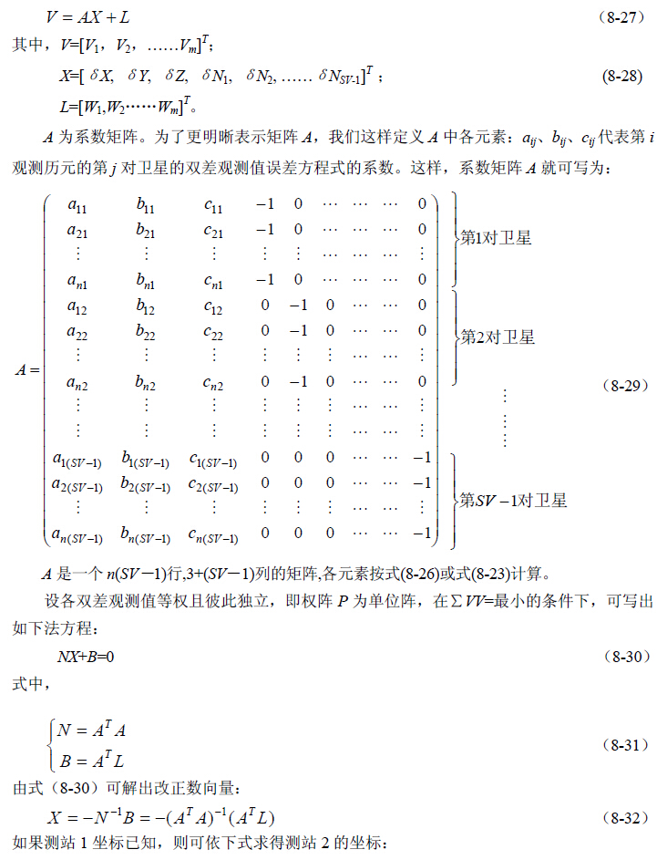 我们用误差方程式(8-22)来组成法方程式。假设在测站1 和2 同步观测了SV 个卫星(SV≥4),则可列出(SV-1)个误差方程,并相应引入SV-1 个整周未知数的改正数,再加上基线向量的3 个坐标改正数,共有SV+2 个未知数。若测站1 和2 同步观测了n 个历元,则总共有m=n(SV-1)个误差方程式。将全部误差方程式写成矩阵形式为: