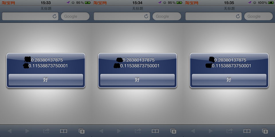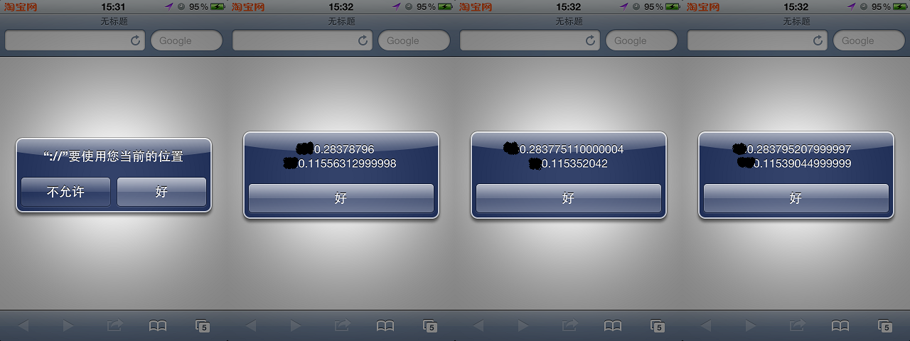 先完全退出Safari,然后打开,直接将这段js敲进地址栏访问,如果成功获取到位置信息,就显示出经纬度,否则显示错误码