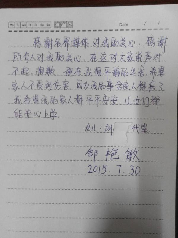 声明全文称:“感谢各界媒体对我的关心,感谢所有人对我的关心,在这对大家说声对不起,抱歉,现在我想平静的生活,希望家人不受到伤害,因为我的事全家都病了,我希望我的家人都平平安安,儿女们都能安心上学。”